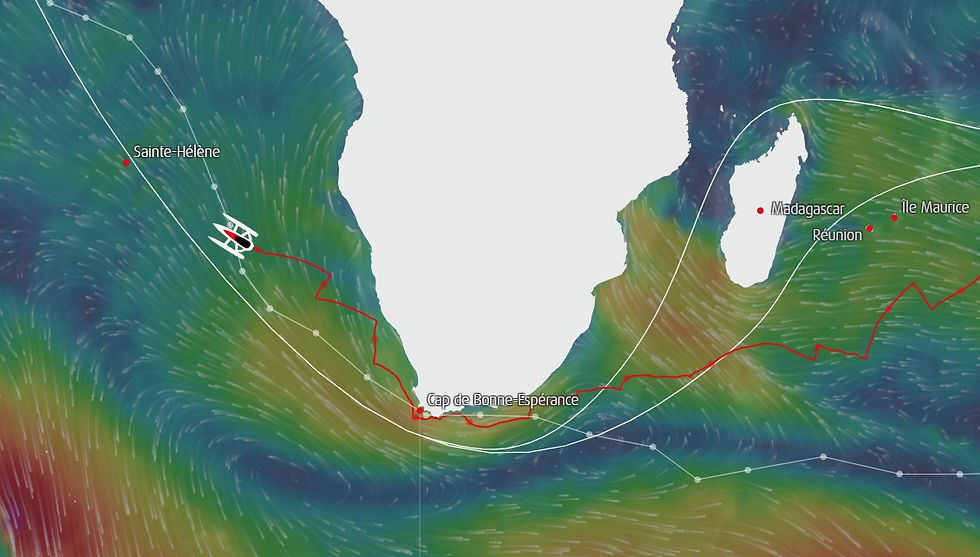 Après être passé sous le cap des Aiguilles, marquant la fin officielle de l'Océan Indien, le skipper et son trimaran sont passés sous le cap de Bonne Espérance, la pointe la plus Sud de l'Afrique du Sud, en 72 j 22 heures 58 min et 10 secondes de tentative sur le tour du Monde à l'envers, en solitaire, sans assistance et sans escale.